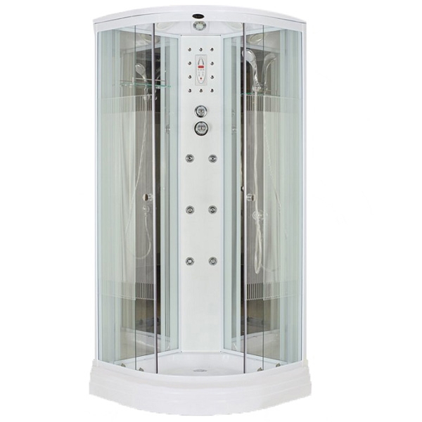 с верхним душем, подсветка, радио, вентилятор, зеркало, полка, ручной душ |