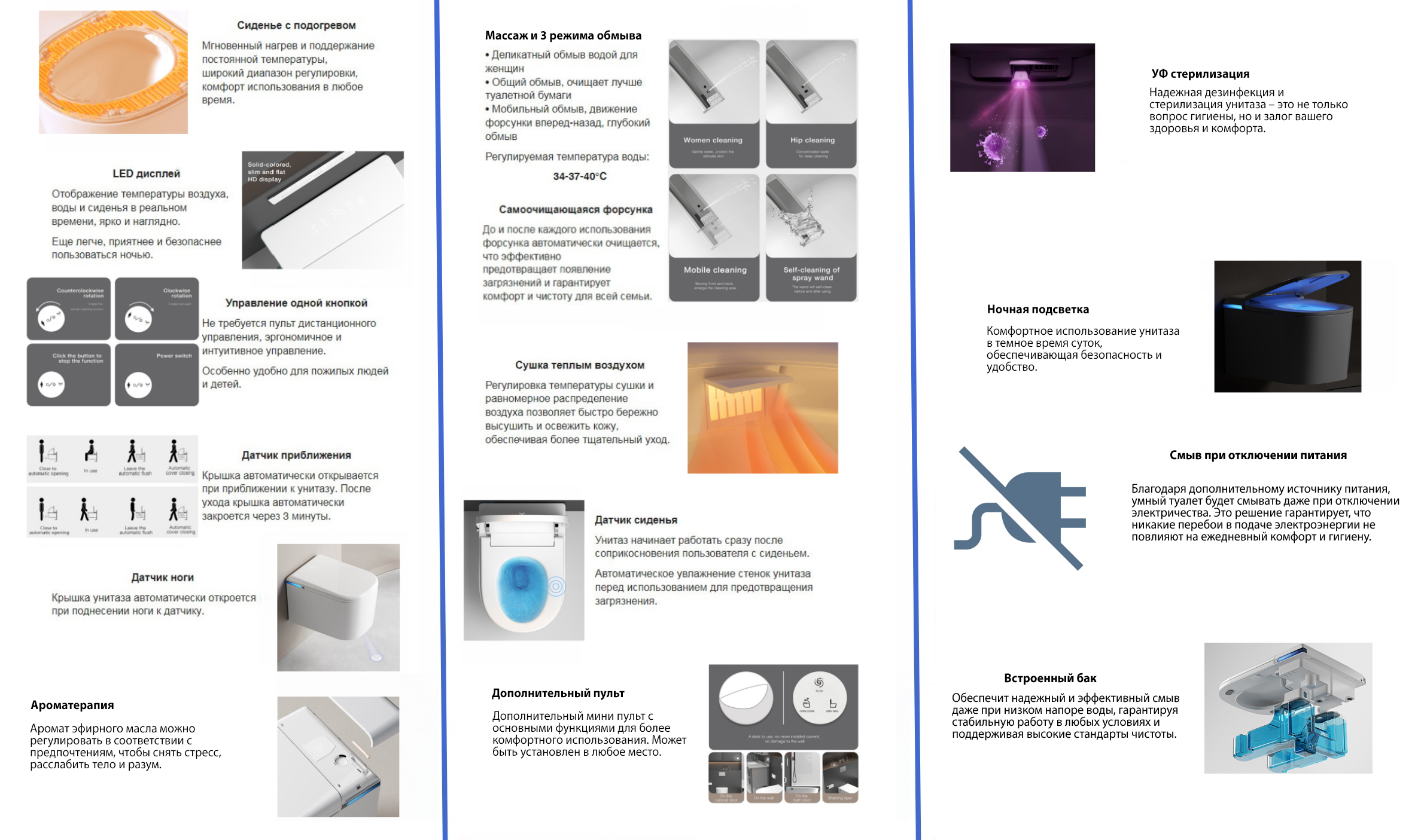 сиденье с подогревом, LED дисплей, датчик приблежения, датчик ноги, УФ стерилизация, ароматерапия, массаж, сушка теплым воздухом, дополнительный пульт, ночная подсветка |