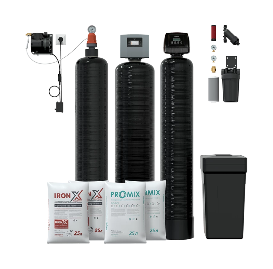 - Фильтр-обезжелезиватель для удаления железа: железо выпадает в осадок в результате окисления, загрузка задерживает его, одновременно снижая мутность воды;