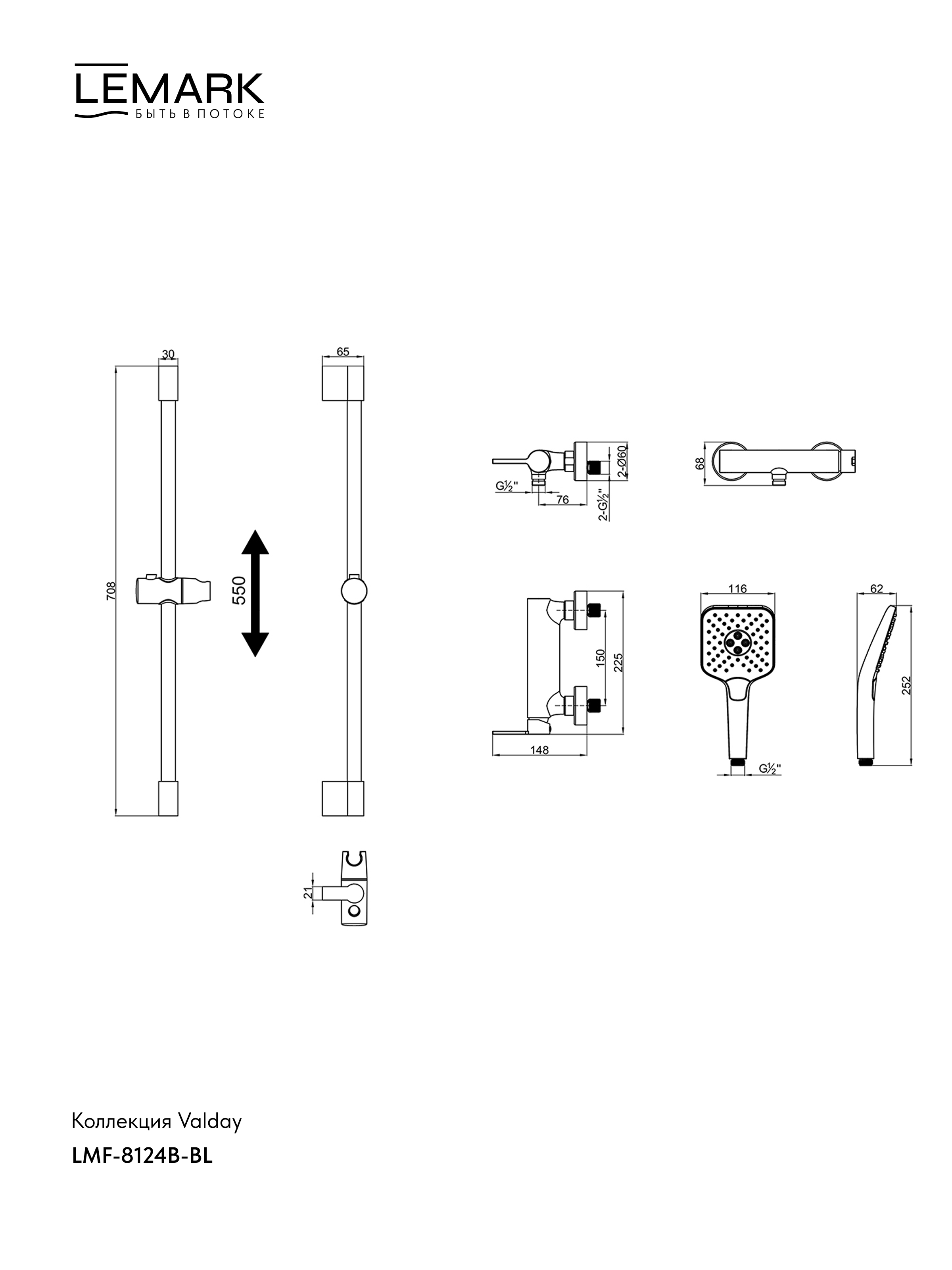 - Аксессуары в комплекте: 3-функциональная лейка 252×116 мм, регулируемое по высоте крепление для лейки, душевой шланг 1,5 м (ПВХ)