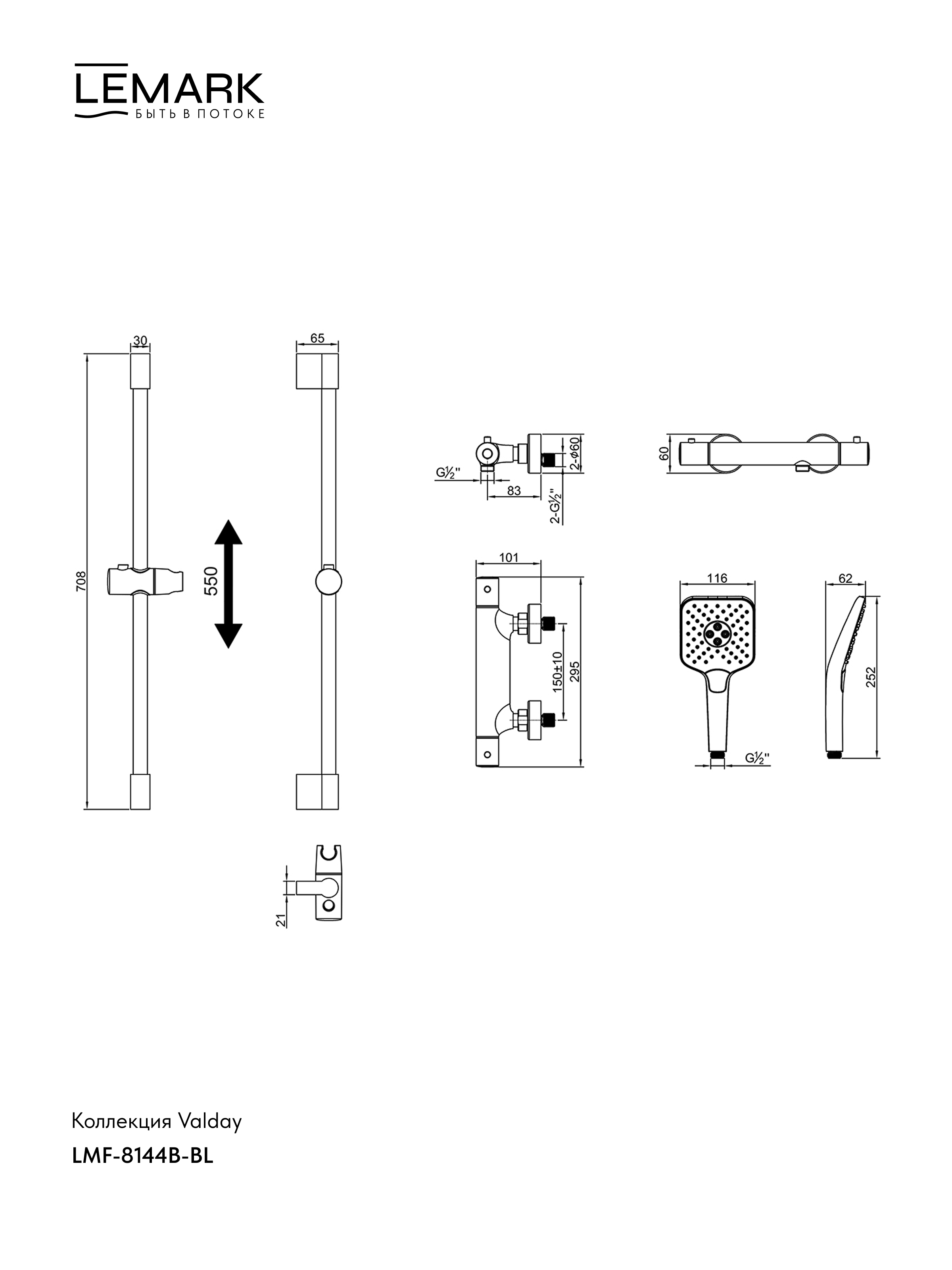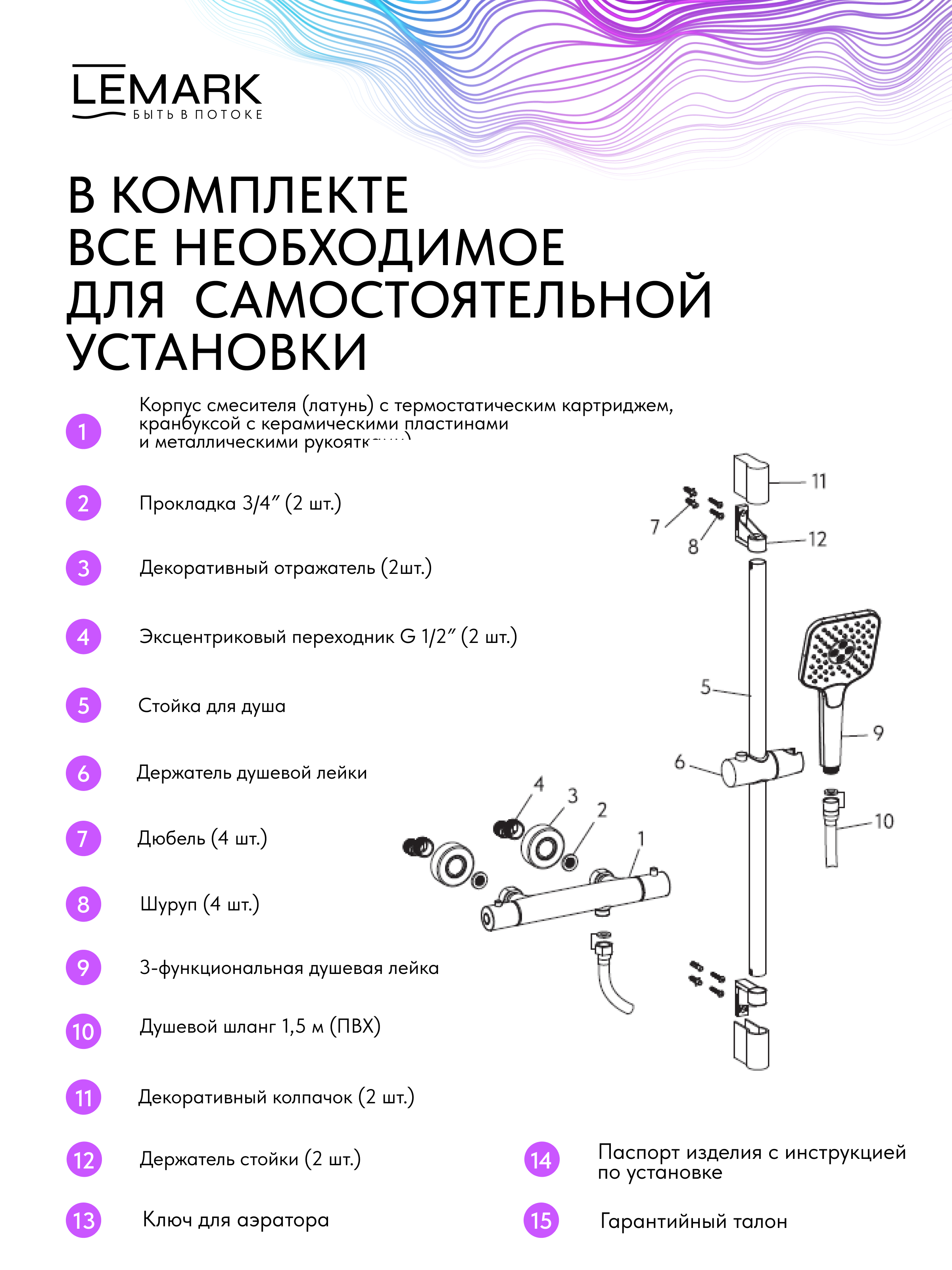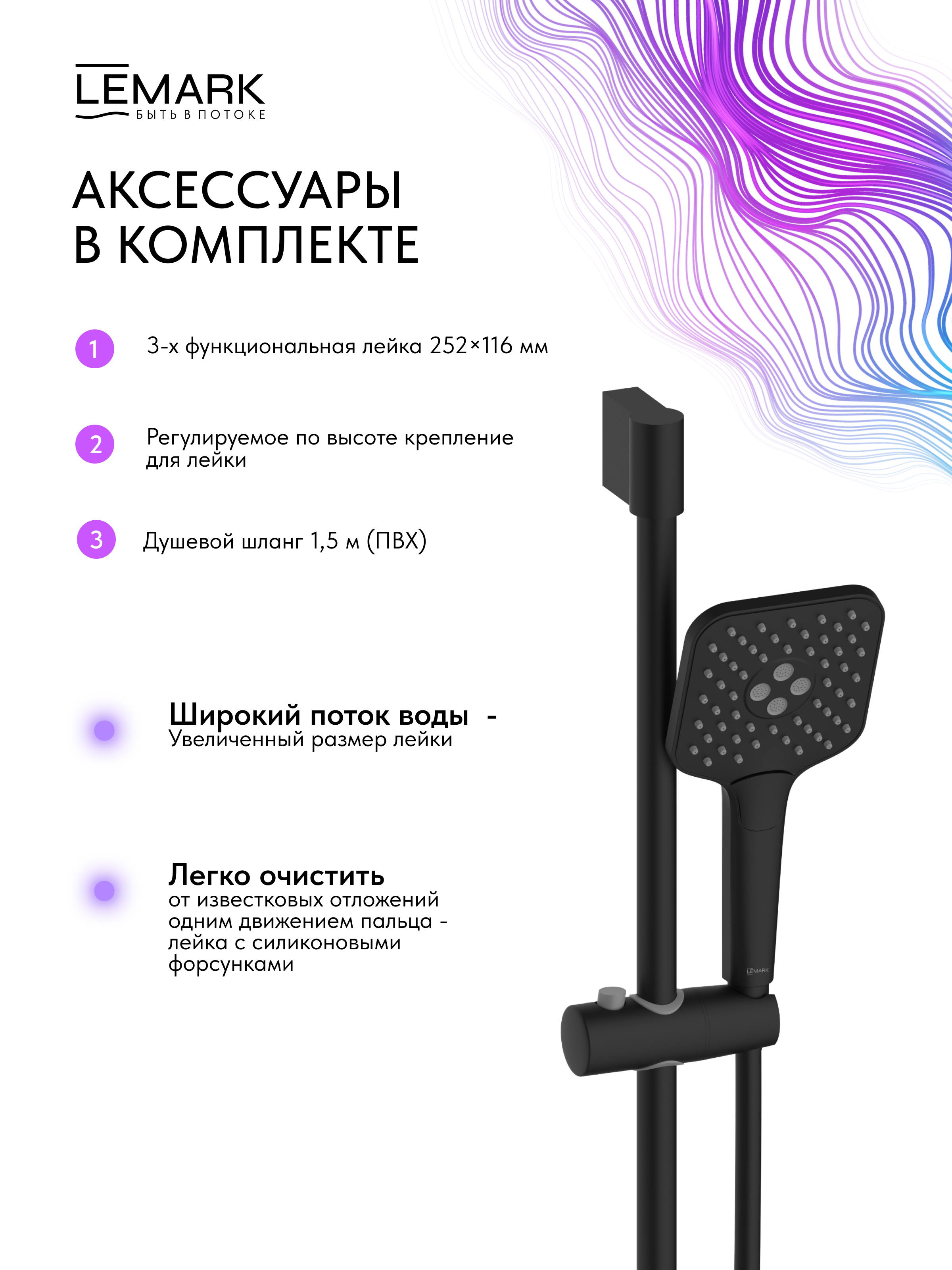 - Аксессуары в комплекте: 3-функциональная лейка 252×116 мм, регулируемое по высоте крепление для лейки, душевой шланг 1,5 м (ПВХ)