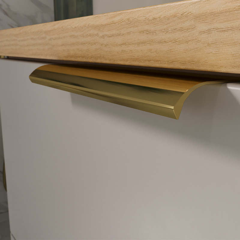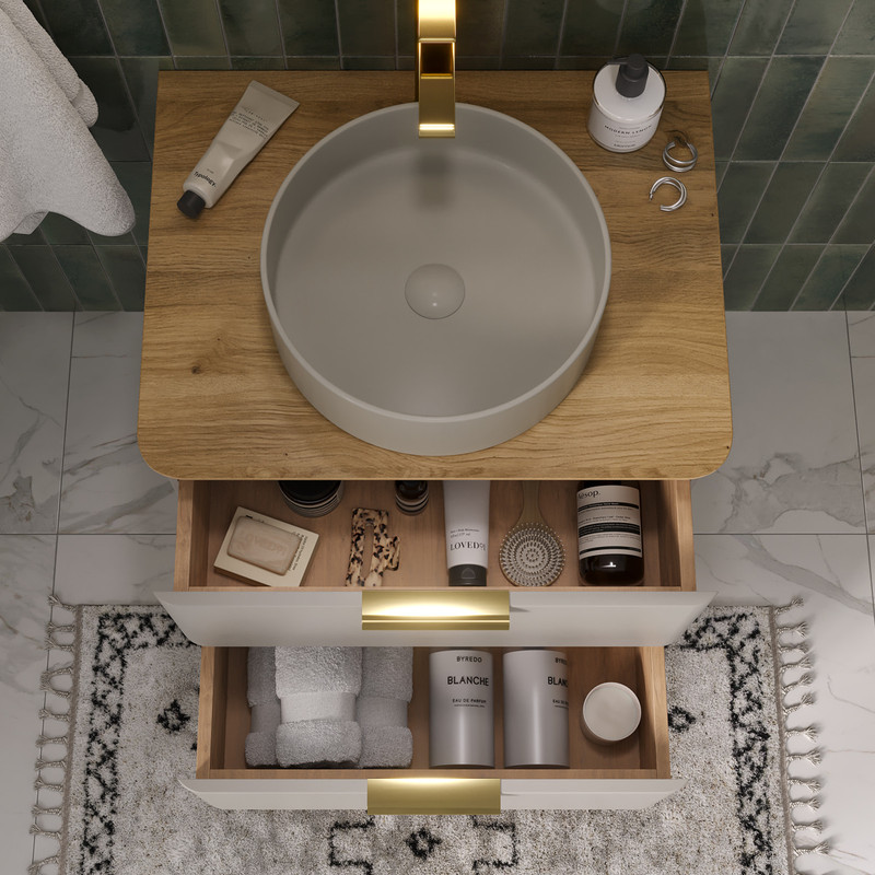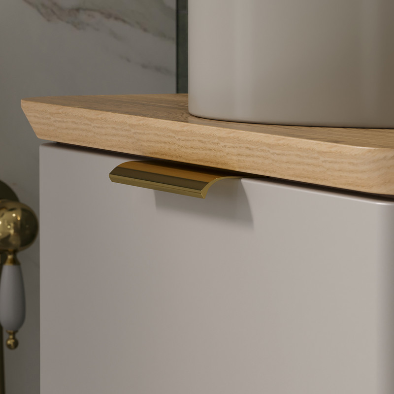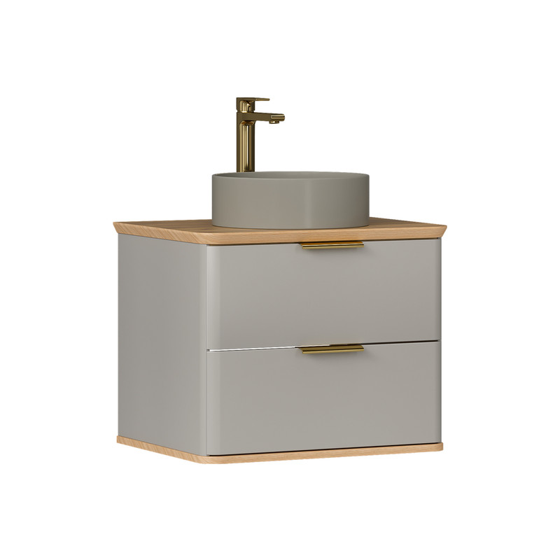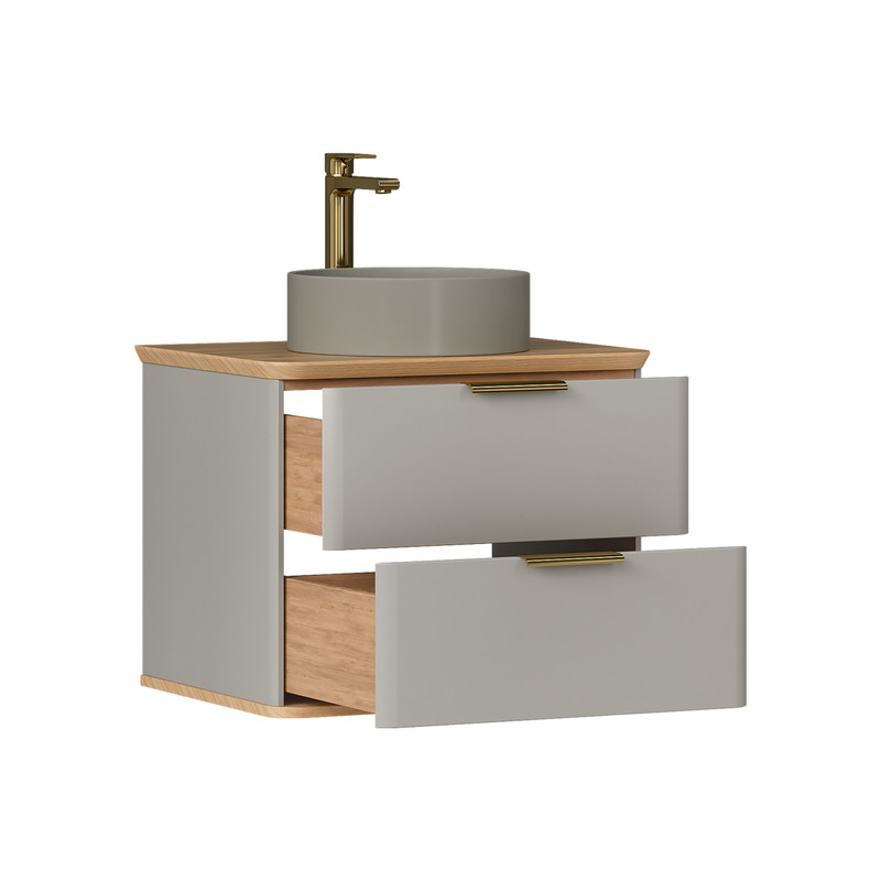 Подвесная тумба с двумя выдвижными ящиками в цвете Амарок и столешницей в цвете Дуб под накладную раковину. Фасад и корпус тумбы изготовлены из МДФ в матовой пленке ПВХ с эффектом "Soft Touch". Столешница также сделана из МДФ. Торцы столешницы покрыты матовой пленкой ПВХ, поверхность столешницы облицована HPL пластиком. Ящики тумбы открываются при помощи металлических ручек под золото. Направляющие скрытого монтажа на ящиках оснащены доводчиками. Поставляется в комплекте с сифоном. Может быть установлена как в подвесном варианте, так и на ножки из массива березы (приобретаются отдельно).