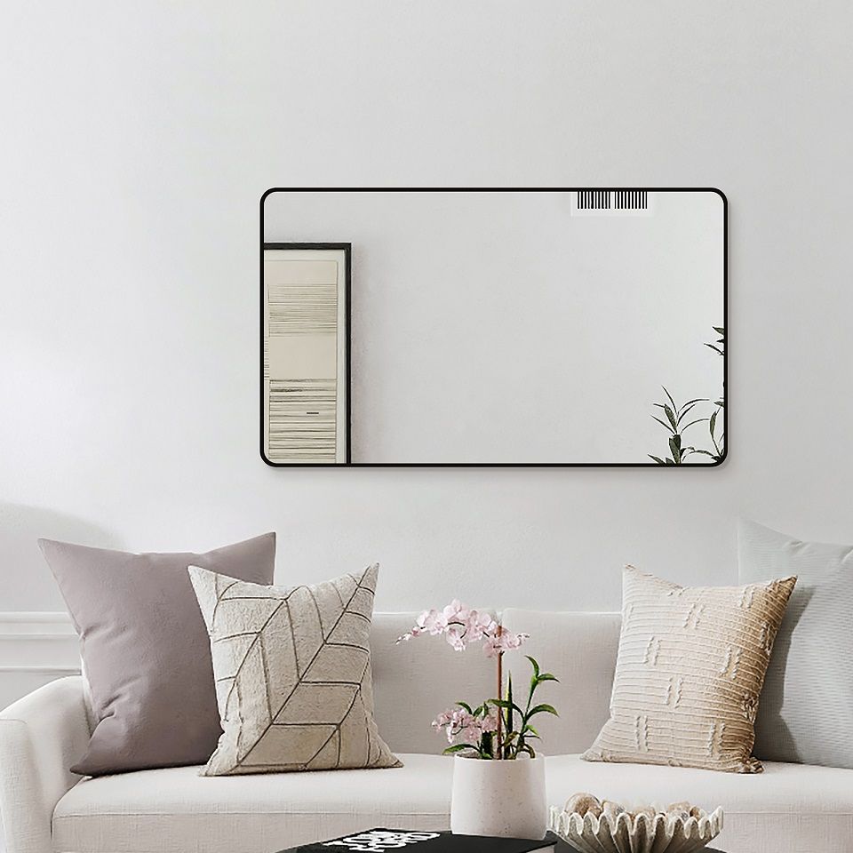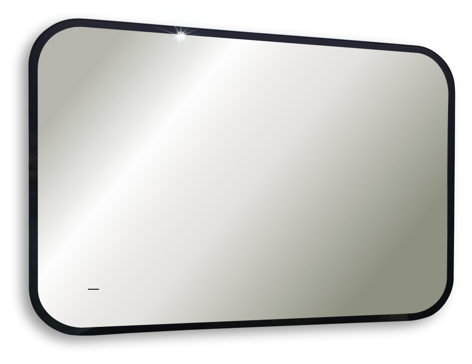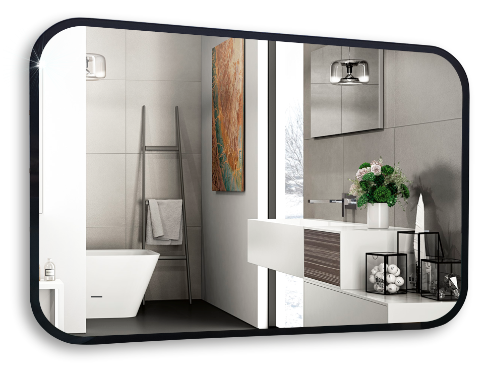 Зеркало лаконичной формы с глянцевой кромкой черного цвета.