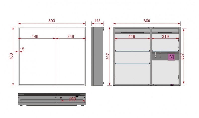 - Встроенная розетка 220V внутри шкафа; USB + micro USB;